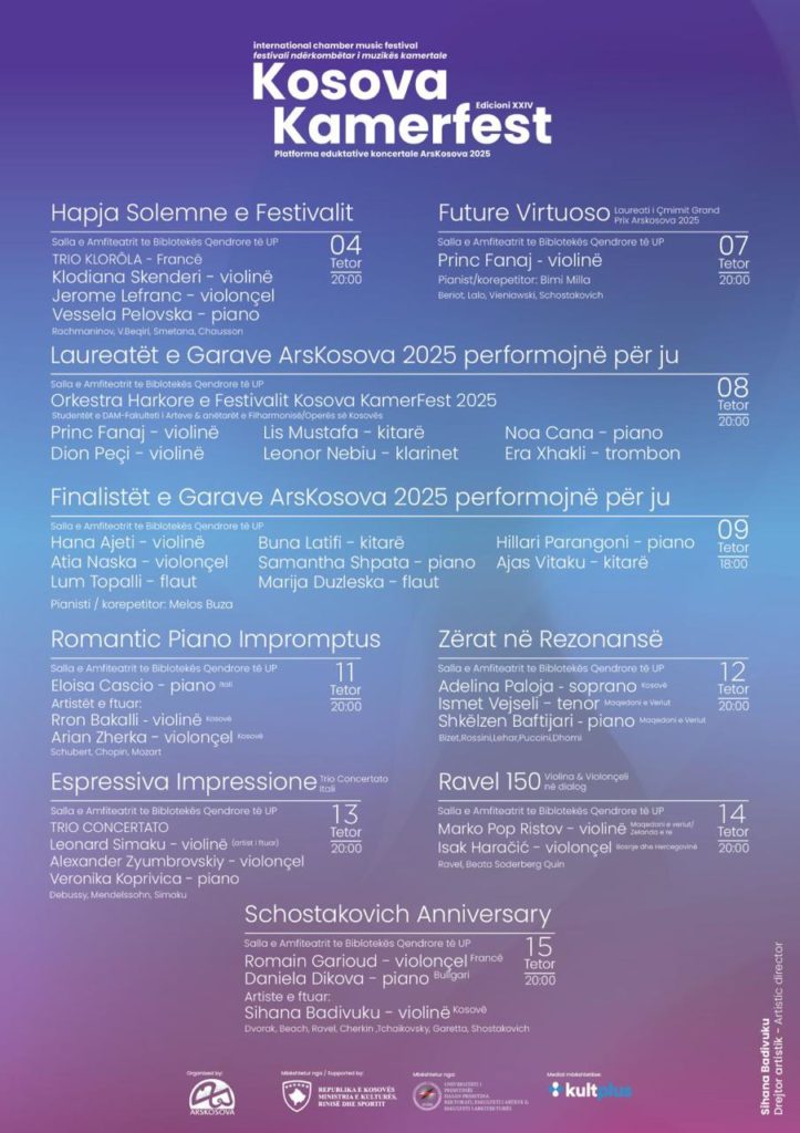 By: Valon October 06, 2025 In Kamerfest Editions / No Comments Facebook Twitter Gmail LinkedIn International Chamber Music Festival: KOSOVA KAMERFEST 2025. Edition XXIV. Artistic Director Sihana Badivuku-Hoxha. 4 October – 15 October 2025, Prishtine, Kosovo Post navigation International Chamber Music Festival: Kosova Kamerfest 2022